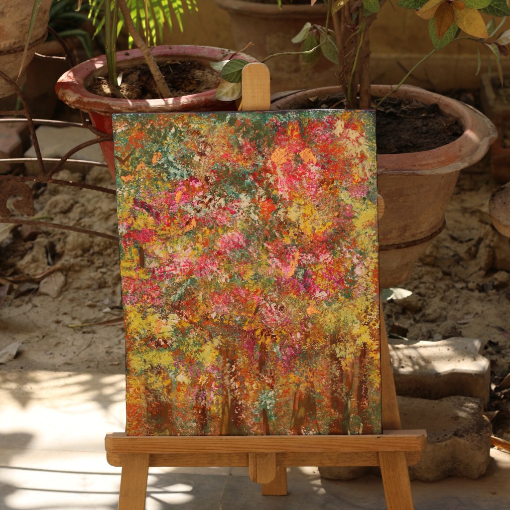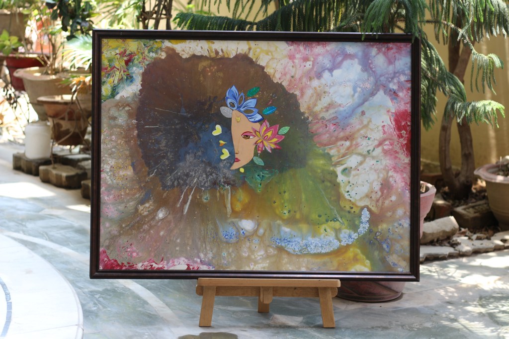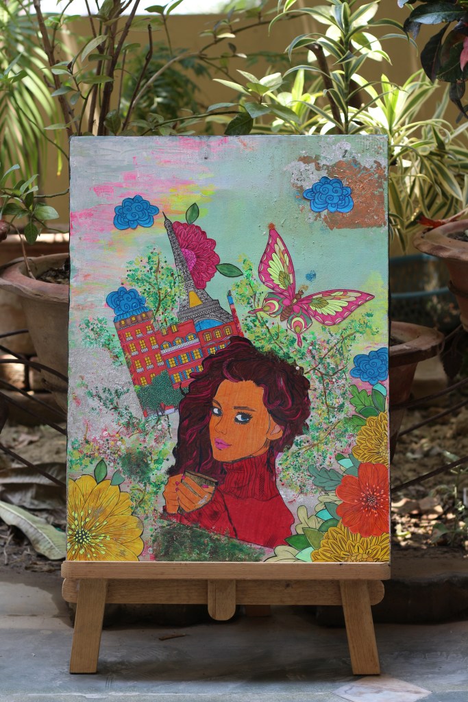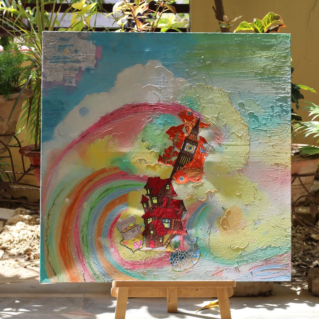 This artwork takes us back to the old days of craftworks. The blend of acrylic paints and paper cutouts radiates a peaceful aura.